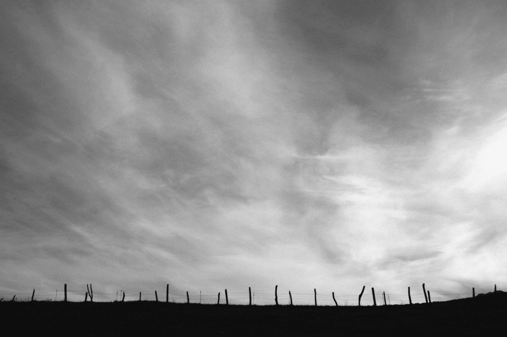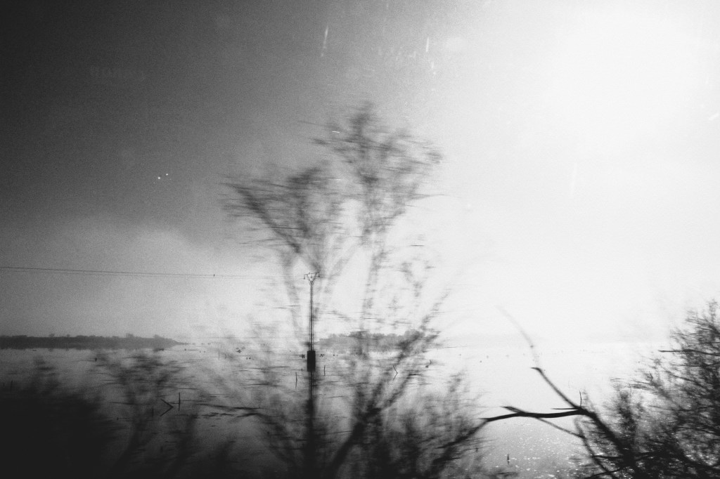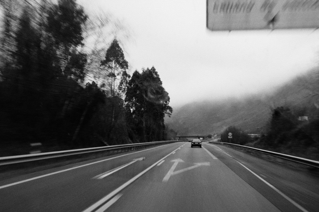 A waterlogged stretch of motorway on which several dead eucalyptus leaves lay half-sunken. The fog descended as the day progressed and a drop sounded like a gunshot as it crashed against the window of the car.