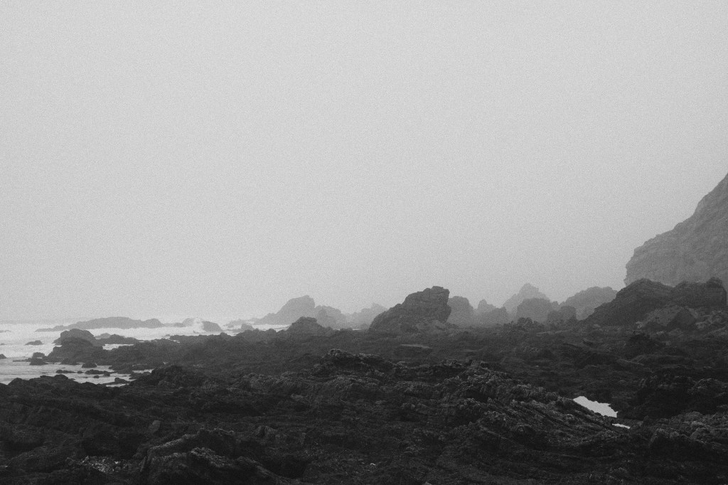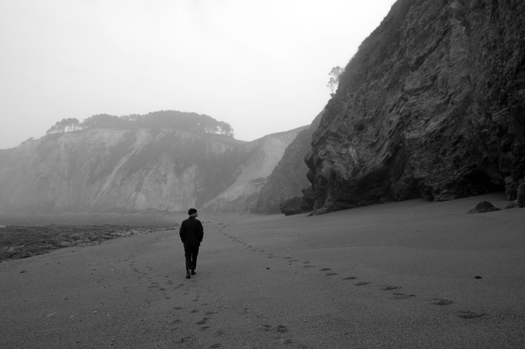 There were several logs scattered along the beach, possibly washed up by the flood, giving it a somewhat funereal appearance. They were like solitary benches that invited the observation of a rough sea.